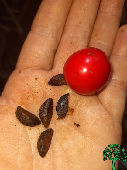 Fruit & Seed Description: Fruit is a bright red, shiny, oblong drupe. Flattened on one side with a longitudinal groove. Contains 2-3 seeds in each cavity on either side of groove.